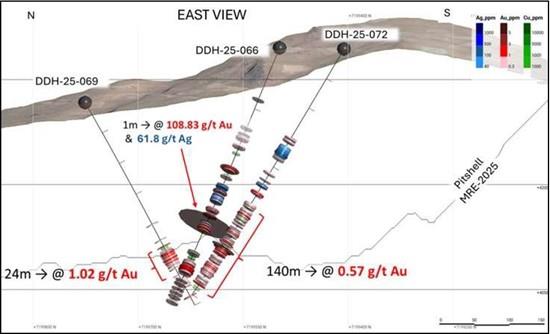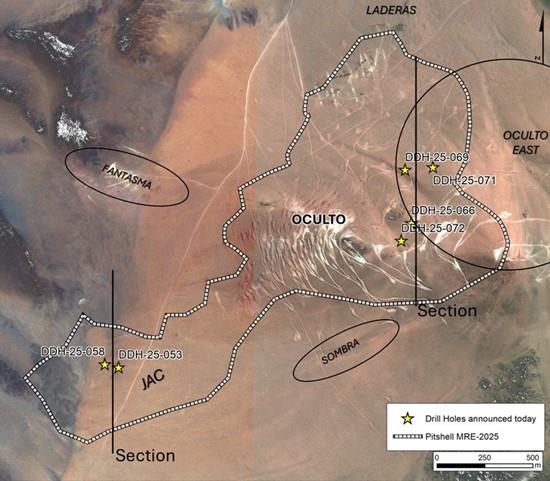 At Oculto East, drilling continues to demonstrate broad, continuous intervals of oxide gold mineralization extending beyond the eastern margin of the current conceptual open pit. Hole DDH 25-072 returned 140.0 m grading 0.57 g/t Au and 8.3 g/t Ag , including a higher-grade interval of 8.0 m at 2.60 g/t Au , while hole DDH 25-066 intersected multiple zones of gold and silver mineralization including 1.0 m at 108.9 g/t Au and 61.8 g/t Ag . Other results, such as 24.0 m grading 1.02 g/t Au in hole DDH 25-069 , further highlight the strong continuity and scale of gold mineralization in this area.