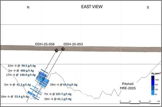 At the JAC zone, drilling shows that shallow silver mineralization extends beyond the western margin of the conceptual open pit, likely following a structure perpendicular to the main trend. Hole DDH 25-053 intersected 29.0 m grading 65 g/t Ag , including 7.0 m at 108 g/t Ag , and hole DDH 25-058 intersected 32.0 m at 100 g/t Ag , including 2.0 m at 400 g/t Ag . Silver mineralization at JAC remains open to the south and west with potential to extend both the tank and heap leach Mineral Resources in these directions.