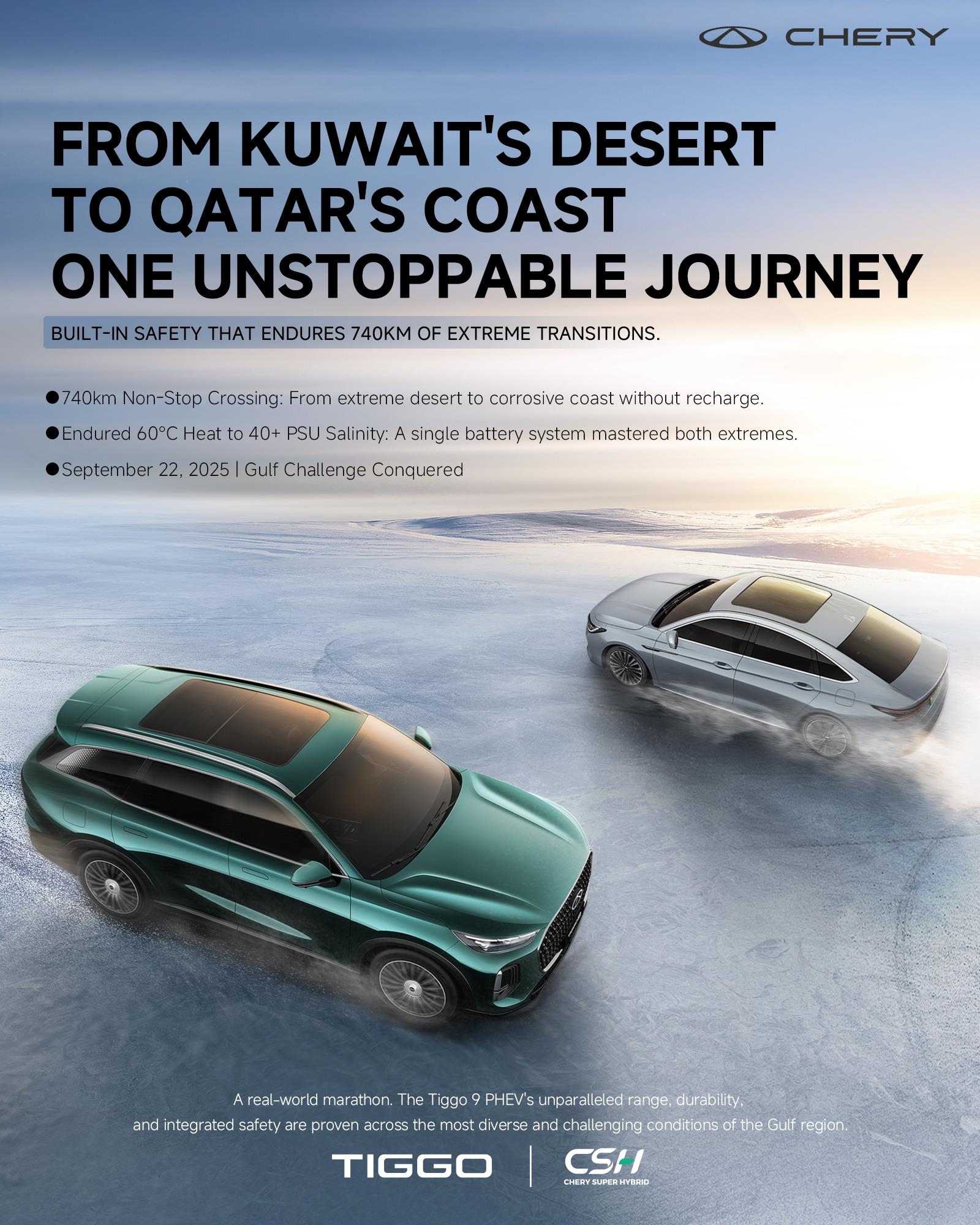 This land-sea-air challenge in the Middle East marks a pivotal part of Chery's 2025 global“Six-Dimension Safety Challenge” and“Endless Horizon Worry-Free Voyage” endurance test. In a region defined by extreme environments and vibrant market potential, TIGGO9 CSH combined technological respect for nature with strength-based credibility. It demonstrated Chery's systematic capabilities in hybrid technology, battery safety, and user co-creation, reinforcing its role as a global leader in smart mobility ecosystems. From lab to road, from technical benchmarks to user experience, Chery is shaping a new paradigm for global mobility-grounded in technology, guided by safety, and driven by users.