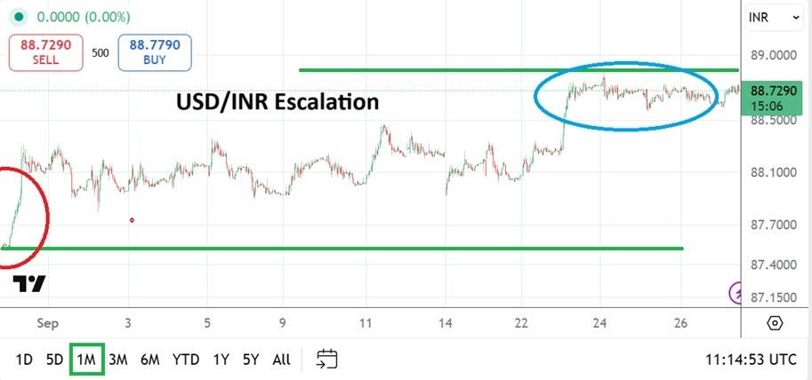 - As the month of October gets ready to start in a couple of days the USD/INR is trading within record high realms. Having started the month of September around the 88.0000 level, the USD/INR has seen momentum continue to take the currency pair to higher realms. As of this writing the USD/INR is around the 88.7300 ratio. Speculators who are hoping for a solid downturn in the USD/INR are unlikely to find an easy direction in the coming weeks.