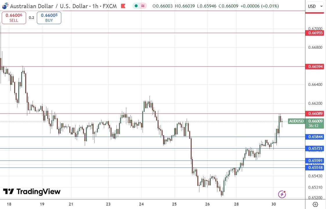 - Short entry following a bearish price action reversal on the H1 time frame immediately upon the next touch of $0.6609, $0.6659, or $0.6696. Put the stop loss 1 pip above the local swing high. Adjust the stop loss to break even once the trade is 20 pips in profit. Take off 50% of the position as profit when the price reaches 20 pips in profit and leave the remainder of the position to run.