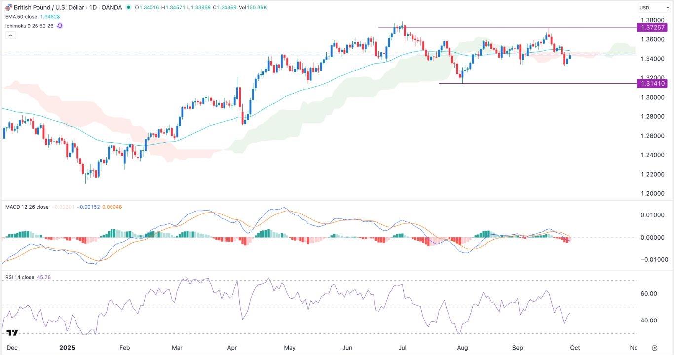EURUSD Chart by TradingViewGBP/USD Technical AnalysisThe GBP/USD exchange rate has pulled back in the past few days as it moved from a high of 1.3725 to 1.3437. It has moved below the 50-day Exponential Moving Average (EMA). The pair is at the lower side of the Ichimoku cloud indicator.The MACD indicator has moved below the zero line, while the Relative Strength Index has dropped below the neutral line at 50.Also, the pair has formed a double-top pattern at 1.3725, its highest swings in July and September. The pattern's neckline is at 1.3140, its lowest swing on August 1.Therefore, the pair will likely resume the downtrend as sellers target the neckline at 1.3141. A move above the resistance level at 1.3500 will invalidate the bearish view.Ready to trade our free trading signals ? We've made a list of the best UK forex brokers worth using.