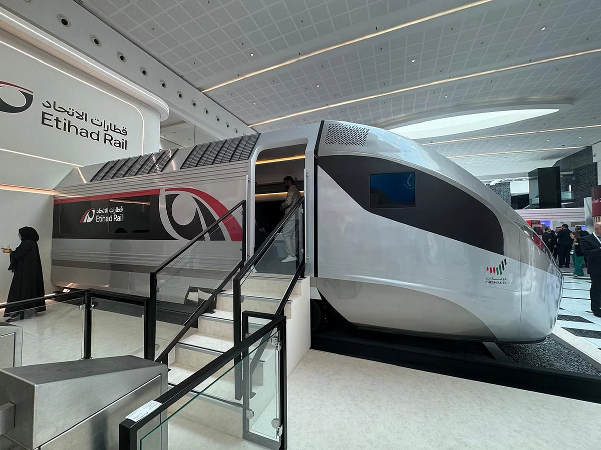 At the Global Rail conference in Abu Dhabi, Etihad Rail offered a first glimpse inside its highly anticipated passenger trains. A model of the silver train cabin was up on display with the iconic black and red Etihad rail logo on them. However, this is just a prototype, not a final look.