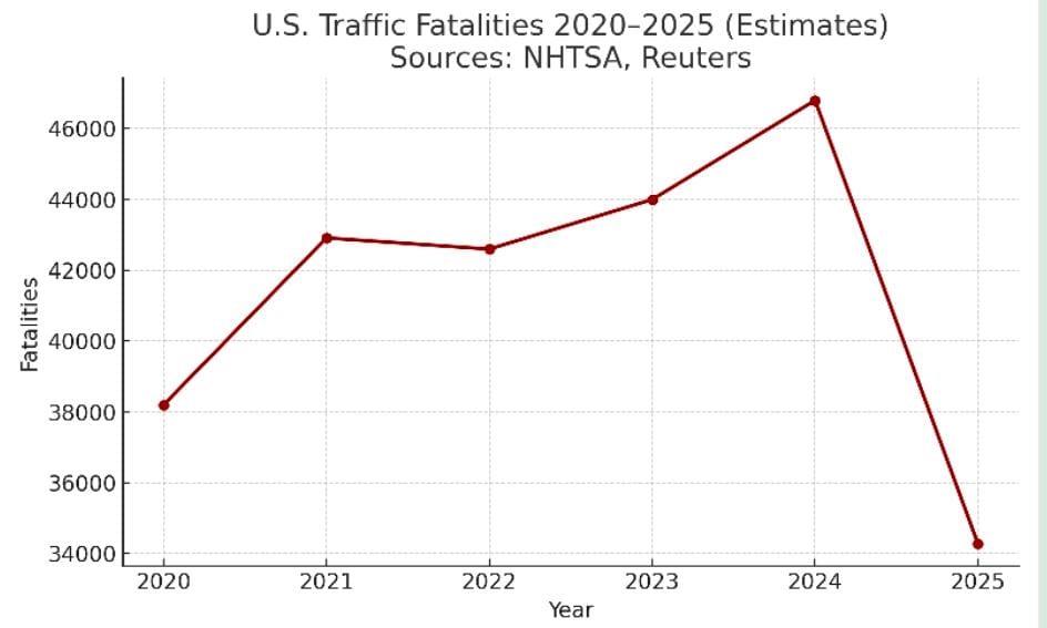 Early 2025 data shows U.S. traffic fatalities fell by 8.2% in the first half of the year, the sharpest decline in years. According to the National Highway Traffic Safety Administratio , an estimated 17,140 lives were lost between January and June. Reuters noted it's the lowest level since 2020.
