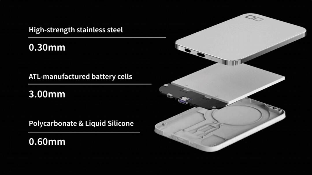 From the 0.3mm stainless-steel frame to the 3.0mm ATL cell pack and the 0.6mm polycarbonate with liquid silicone coating , every component has been optimized for minimal thickness. Every fraction of a millimeter was carefully considered - not a single 0.1mm wasted. This engineering approach enabled the product's remarkable 4.98mm profile, proving that safety and durability need not be compromised for slimness.