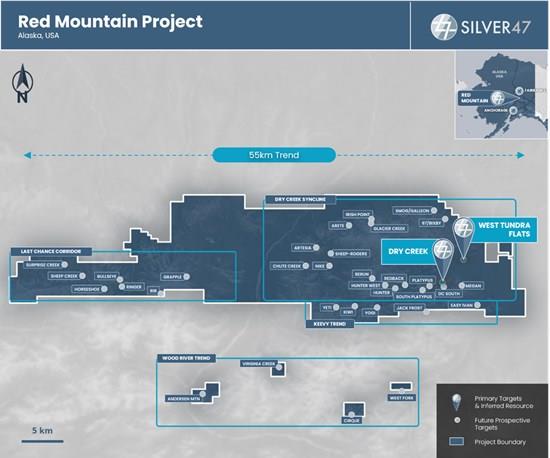 The 2025 Red Mountain drill program consisted of fifteen drill holes - eight holes at the Dry Creek target (Figure 1) and seven holes were completed at the West Tundra Flats target (Figure 1). The Dry Creek and West Tundra Flat targets together account for an inferred resource of 15.6 Mt at 336 g/t AgEq* for 168.6 million silver equivalent ounces.