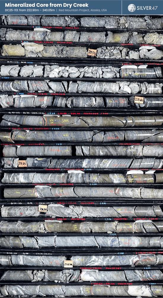 Figure 4: ( see attached figure ). Mineralized core from drill hole DC25-113 at the Dry Creek deposit showing disseminated, semi-massive and massive sulfide mineralization featuring pyrite, sphalerite and chalcopyrite (222.9 to 240.05m downhole). Photo is not intended to be representative of broader mineralization.