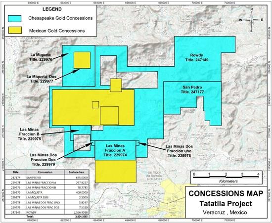 The Tatatila concessions surround Mexican Gold's Las Minas Project. Several skarn prospects, including possible extensions of the Las Minas existing resource, have been discovered on the Tatatila Project by Chesapeake.
