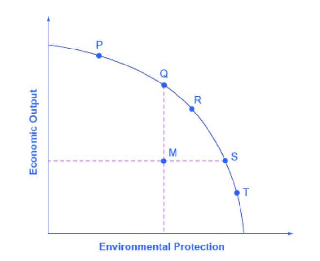 In fact, mainstream economics already has a simple way of depicting this in a memorable picture - a production possibilities frontier . A PPF illustrates society's tradeoff between two things. You can draw a PPF that illustrates the tradeoff between production and the environment; in fact, introductory econ courses do this all the time: