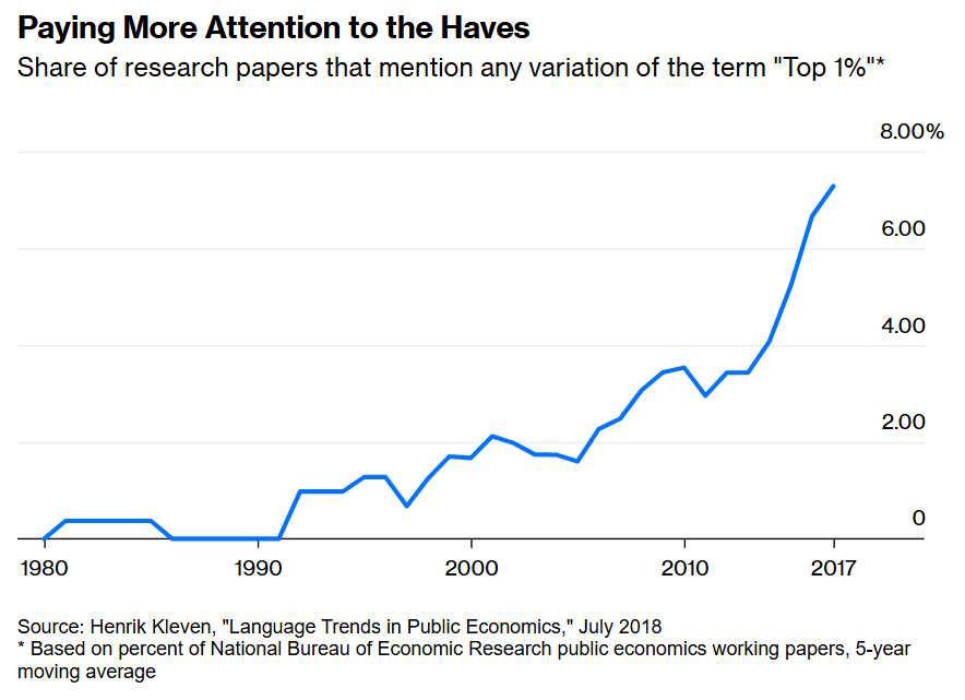 These changes also moved the field more to the left politically. To take just one small example, you can see a lot more economists writing about inequality in recent years: