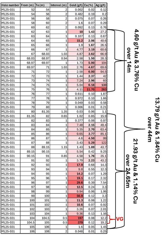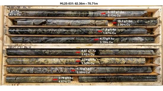- Drill hole ML25-31 represents the first ever hole in the newly identified "TESS Zone". Results include a wide 44m intercept averaging 13.79 g/t Au, 1.84%Cu. & 38.08 g/t Ag starting at 62m downhole. This interval includes a higher-grade intercept of 21.94 g/t Au over 24.65m starting at 81.35m downhole. Mineralization remains open at depth and along trend.