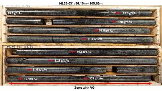 Figure 2: ML25-031 from 96.15 - 105.05 with sample intervals and gold grades. Red arrows mark the beginning of the sample intervals.