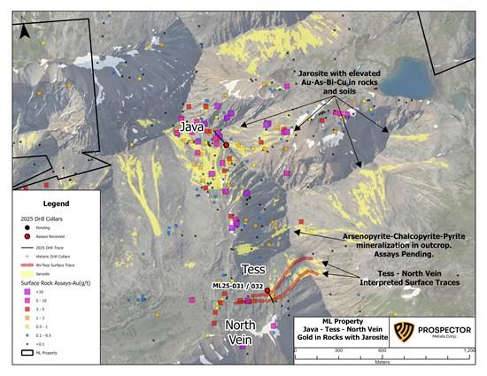 - Follow up mapping and prospecting after hole ML25-31 was drilled subsequently identified numerous altered and mineralized surface occurrences along the projected trace of several mineralized corridors, suggesting the exploration potential for additional TESS Zone discoveries remains very high.
