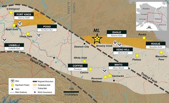 The 100% owned ML Project is a reduced intrusion related gold system (RIRGS) located in the Tombstone Gold Belt in the Yukon Territory, Canada approximately 25km northeast of the former Brewery Creek Mine. The property consists of a contiguous land package covering approximately 10,869 hectares encompassing at least four Tombstone age intrusions and associated dikes and sills. Multiple high-grade occurrences are known on the project within a variety of geological environments including intrusion-hosted Au-Cu within sheeted veins-breccias; structurally controlled and disseminated Au-Cu within calc-silicate altered calcareous to clastic sedimentary units and mafic sills; high-grade vein hosted Au; and vein hosted Ag-Pb-Zn. Gold mineralization on ML has a distinct As-Bi-Te +/-W association and there is strong evidence for multiple mineralizing events across the property.