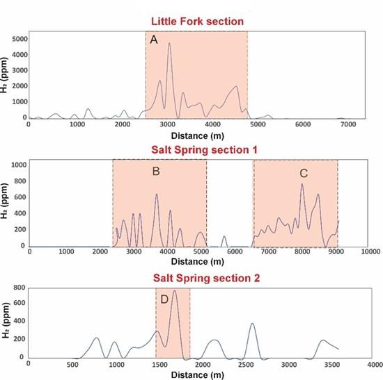 Figure 4. Sections showing the variability of soil hydrogen concentrations along the Little Fork and Salt Springs sections 1 and 2 of the Springhill area.