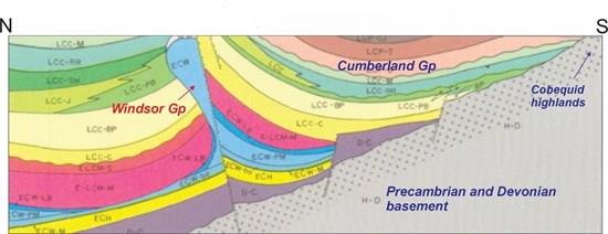 The geology of the Springhill area is complex because it is affected by salt tectonics related to the emplacement of diapirs of salt, anhydrite (and gypsum) formations rising through the carbonaceous sedimentary rocks of the Cumberland Group (Fig.2). This particular geology is accompanied by faults, deeper-dipping geological contacts, horst-like rock uplifts and folds. These structures can create traps and/or potential migration pathways for hydrogen.