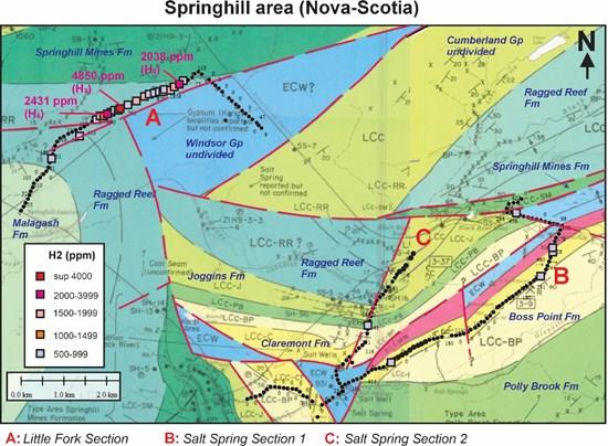 The geological map, highlighting the chaotic and discontinuous nature of the geology of the Springhill area, also shows the location of the sampling sites along the Little Fork and Salt Spring sections (sections 1 and 2) (Fig. 3). As for the Southampton exploration area, the highest concentrations of hydrogen in the soils are observed over the Carboniferous Ragged Reef Formation, which consists of alternating fluvial sandstones, conglomerates, mudstones, lake limestones and rare coal horizons. In the Cumberland Basin, the characteristics of the rocks in this geological formation appear to be highly favorable to the presence of hydrogen in the subsurface, especially when they are located near certain regional faults. On the other hand, the results of the measurements carried out over the salt, anhydrite and gypsum formations of the Windsor Gp (Fig. 3; Little Fork section) show very low soil-gas hydrogen concentrations of around 0 ppm, which confirms the very low permeability of the evaporite formations, which seem to constitute real barriers limiting the ascent of hydrogen. "In addition, it is important to note that evaporites are often associated with structural traps. Their density and rigidity can cause folding and faulting, creating potential traps for hydrogen," added Prof Richer-Laflèche.