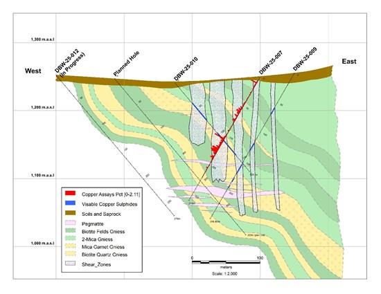 The mineralization intercepted in holes DBW-25-003 and DBW-25-007 occurs broadly within near vertical shear zones; copper sulphide mineral emplacement occurring within the shear zone, the overlying hanging wall rock, and immediate foot wall rock. Copper mineralization is predominantly comprised of bornite, chalcopyrite and chalcocite occurring in disseminated form; occasional-massive mineralization within quartz blow outs; coarse-grained sulphide clotting; and within healed fractures and veins.