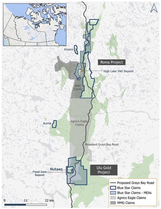 Blue Star is a mineral exploration and development company focused in Nunavut, Canada. Blue Star's landholdings total 300 square kilometres of highly prospective and underexplored mineral properties in the High Lake Greenstone Belt. The Company owns the Ulu Gold Project, comprised of the Ulu Mining Lease and Hood River Property, and the Roma Project. A significant high-grade gold resource exists at the Flood Zone deposit (Ulu Mining Lease), and numerous high-potential exploration targets (gold and critical minerals) occur throughout the Company's extensive landholdings, providing Blue Star with excellent resource growth potential. The site of the future deep-water port at Grays Bay is 40 - 100 km to the north of the properties, and the proposed route corridor for the all-weather Grays Bay Road passes close by the Roma and Ulu Gold Projects.