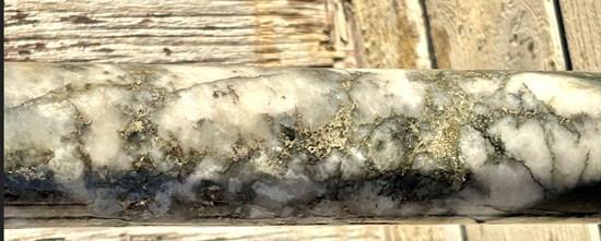 Hole 25UND002 was designed to test beneath a Loupe-EM anomaly along with a 2025 surface grab sample grading 8.72 g/t Au. This anomaly is part of an EM trend located within the fold nose of the gabbro sill, ~335 metres west-northwest of the Gnu Zone resource area and has the potential to extend over a 400-metre strike length. This drill hole intersected several mineralized intervals, characterized by white quartz veining and net-textured to blebby pyrrhotite, lesser pyrite and minor sphalerite and chalcopyrite (Image 1). Highlights include 2.79 metres of 4.33 g/t Au from a quartz vein hosted in a narrow embayment of greywacke at a depth of 54.14 metres downhole, 7.97 metres of 1.40 g/t Au and 5.70 metres of 7.31 g/t including 1.80 metres of 21.1 g/t Au, hosted in quartz veining in gabbro from 81.9 metres and 105 metres downhole respectively.