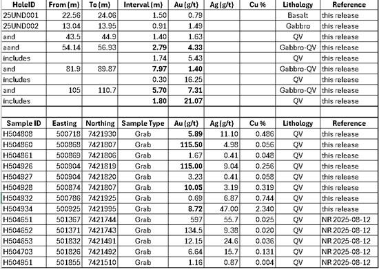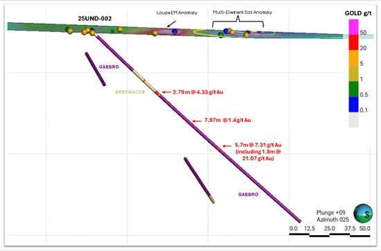 - 25UND-002 returned 2.79 meters (m) of 4.33 grams/tonne gold (g/t Au) from 54.14 metres downhole, and 7.97 m of 1.40 g/t Au and 5.70 m of 7.31 g/t (including 1.80 m of 21.1 g/t Au) from 81.9 metres and 105 metres downhole respectively