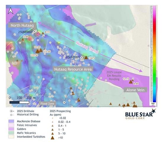 Blue Star's 2025 field program successfully extended the prospective Nutaaq trend through targeted prospecting and subsequent drilling of both high-grade surface mineralization and new structures parallel to known Nutaaq veining, highlighted by Loupe electromagnetic (EM) data acquired during the 2024 program. The prospective trend covers over 1,600 metres of strike length and extends into the structurally thickened fold hinge of the gabbro sill (Figure 2).