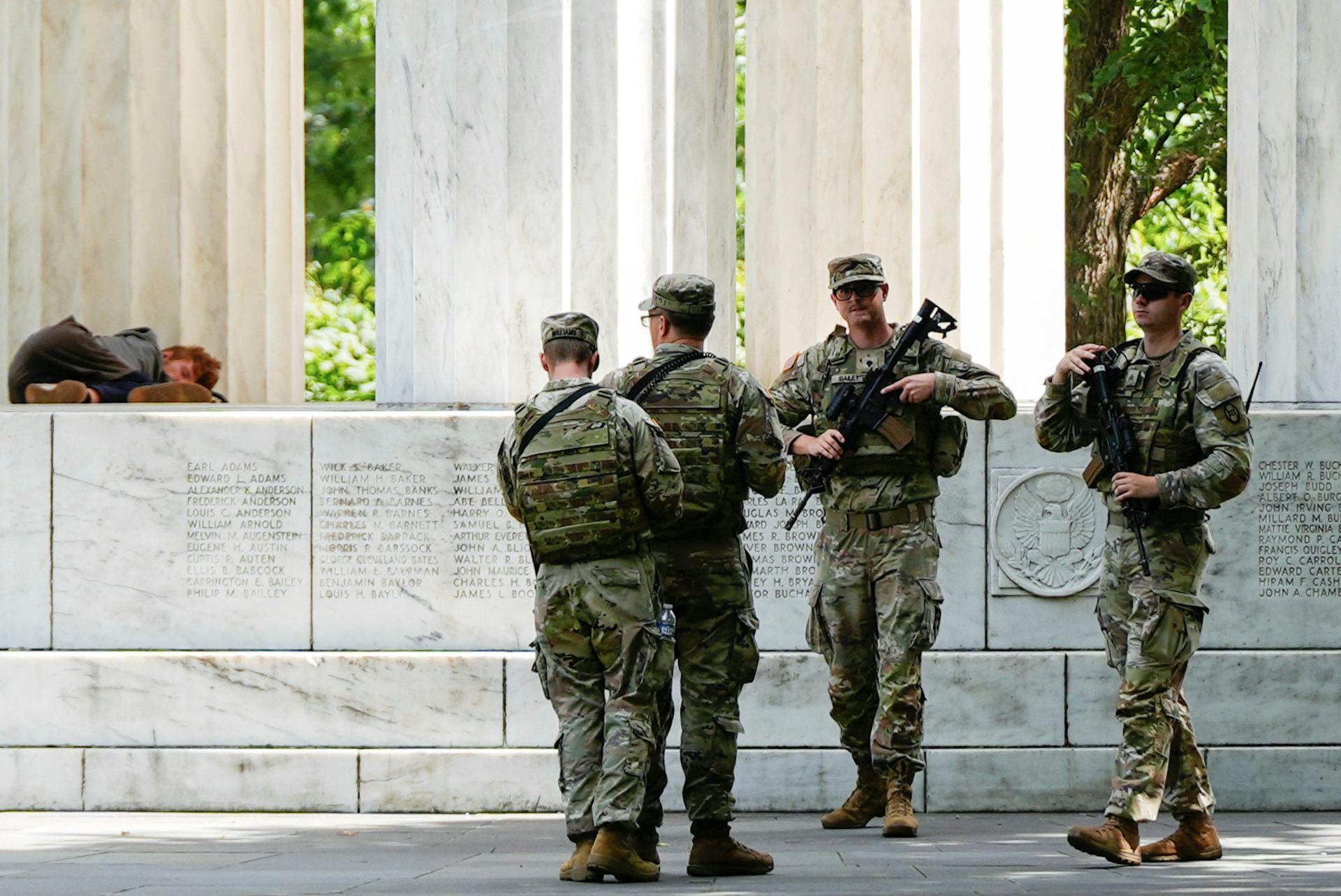 Armed National Guardsmen patrol near a homeless person on the National Mall in August 2025 in Washington, D.C. (AP Photo/Julia Demaree Nikhinson)