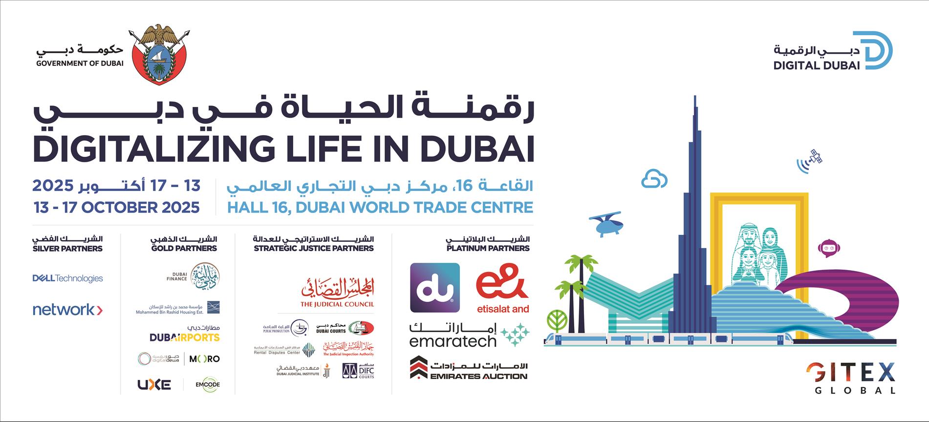 Participating entities include Digital Dubai and its affiliates; the Dubai Data and Statistics Establishment and Digital Dubai Government Establishment, Roads and Transport Authority (RTA), Dubai Municipality, Dubai Health Authority, Dubai Culture and Arts Authority, Knowledge and Human Development Authority, Dubai Civil Aviation Authority, Dubai Department of Economy and Tourism, Dubai Customs, Legal Affairs Department of the Government of Dubai, Dubai Government Human Resources Department, Islamic Affairs and Charitable Activities Department, Dubai Future Foundation, Security Industry Regulatory Agency, Dubai Health, Mohammed bin Rashid Al Maktoum Knowledge Foundation, Dubai Corporation for Ambulance Services, Virtual Assets Regulatory Authority, Dubai International Financial Centre Authority, Dubai International Financial Centre, Dubai Chambers, Dubai Trade, Dubai Integrated Economic Zones Authority, Dubai Financial Market, Mohammed Bin Rashid Space Centre, Dubai Cyber Security Center, Dubai Sports Council, Dubai Humanitarian, Transport Security Administration, Mohammed bin Rashid Library, Mohammed bin Rashid School of Government, the Digital School, and Hamdan bin Mohammed Smart University. Platinum partners include E&, Du, Emaratech, and Emirates Auction, while Strategic Justice partner is The Judicial Council, which includes: Dubai Courts, the Public Prosecution, the Judicial Inspection Authority, the Rental Disputes Center – DIFC Courts, and the Dubai Judicial Institute. The Gold Partners includes: Dubai Finance, Mohammed bin Rashid Housing Establishment, Dubai Airports, Digital DEWA/Moro Hub, UXI, and EMCODE. In addition, Dell and Network International are participating as Silver Partners.