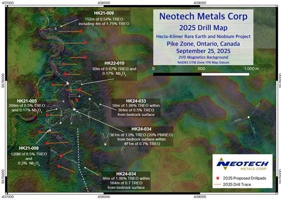 Reagan Glazier, CEO commented, "We're very excited to be advancing this strategic rare earth and niobium asset within Ontario at a time when global markets are actively seeking secure, North American sources of critical minerals. The Hecla-Kilmer Project represents a unique opportunity - its rare earth mineralization is hosted in apatite, a setting that may offer significant advantages in processing efficiency and scalability compared to many existing projects. With drilling now underway, we're positioning Neotech to deliver meaningful technical and economic milestones that could set a new benchmark for rare earth development in Canada."