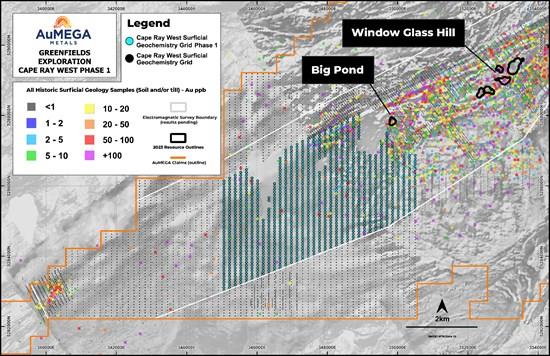 In August 2025, AuMEGA completed an extensive till geochemical survey across the Cape Ray West area, collecting 1,082 till samples and 91 rock samples over 16 km2. Historical data confirms a strong correlation between till anomalies and known gold deposits at Cape Ray (Figure 5), underscoring the significance of this dataset.