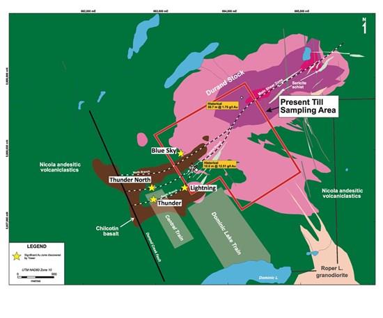 As no infill till sampling has previously been performed in the 600 m gap between the sampled portion of the Dominic Lake Train and the Blue Sky zone, this gap will also be infilled in the present survey (see Fig. 3) to determine whether any significant gold zones other than Lightning and Blue Sky are present in the underlying Nicola tuffs.