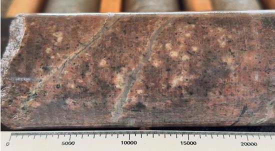 Figure 4: Drill hole MRV002 (32m); A-type hydrothermal quartz veins with sericitic haloes within potassic altered porphyry.