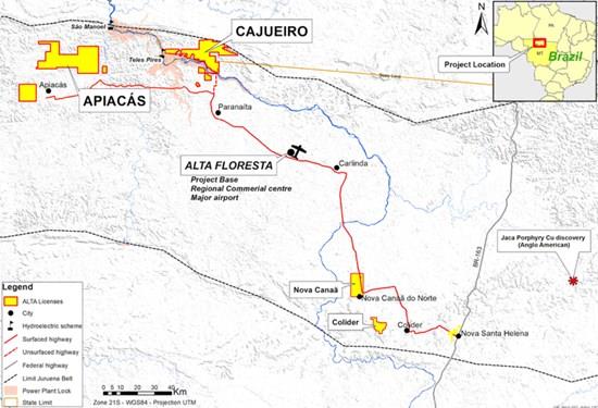 The Cajueiro district is located approximately 75km NW of the town of Alta Floresta in the state of Mato Grosso (Figure 1) in central western Brazil. The project is easily accessible by road, lies on open farmland and has grid power and a local water supply. Cajueiro is the most advanced of the key projects that Altamira controls in the region (Figure 1).