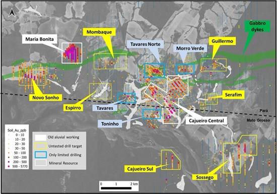 Figure 2: Recent scout drill targets Tavares Norte and Morro Verde in relation to the defined Mineral Resources at Cajueiro Central and Maria Bonita (white labels) and undrilled district targets (yellow). An alignment of six of the targets occur in close spatial association to a pronounced east-west fault corridor marked by later gabbroic dykes.