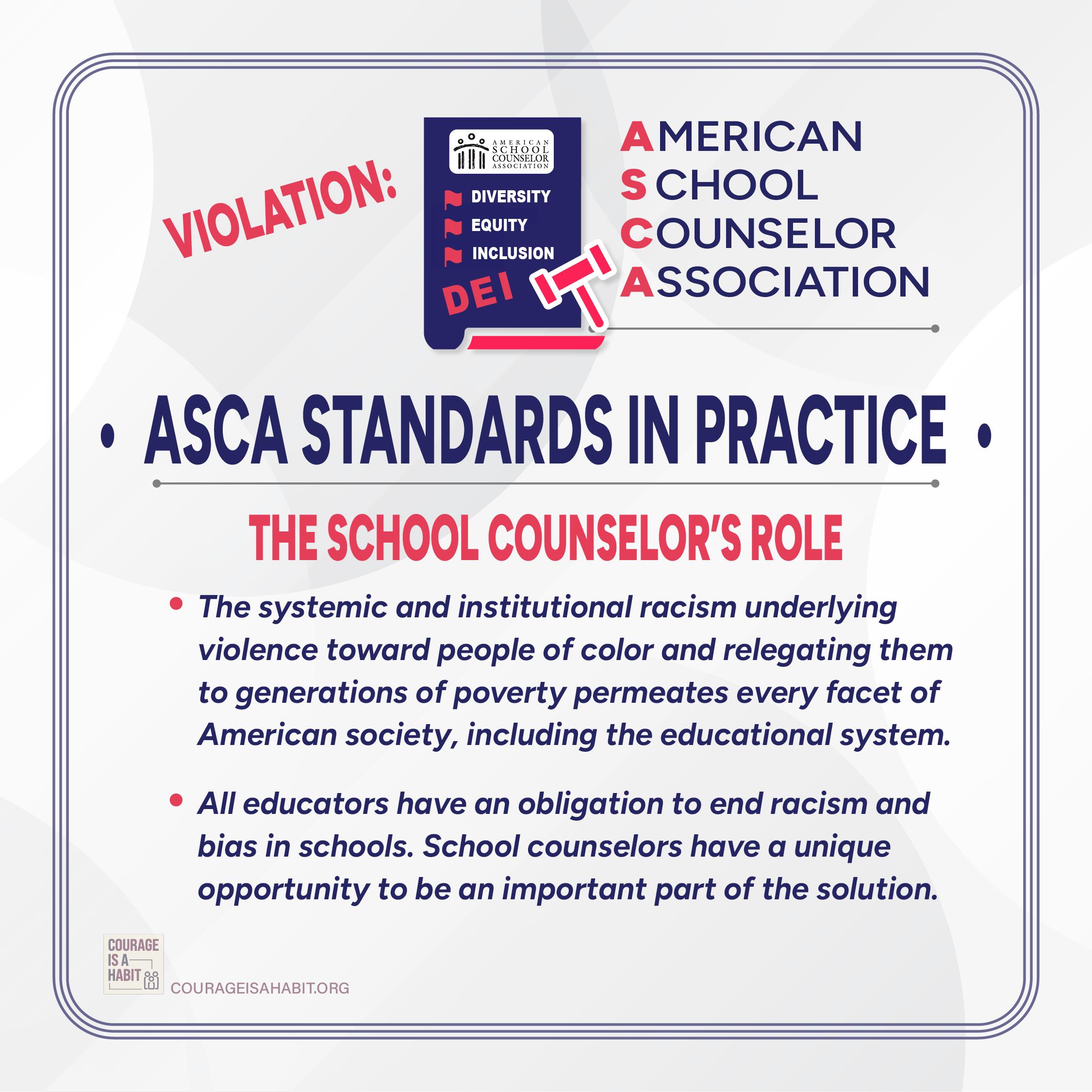 - Anti-Racism and CRT Integration : ASCA mandates systemic changes by embedding Critical Race Theory, following the radical Southern Poverty Law Center's Social Justice Standards and promoting identity-based division. Cultural Division: Counselors are trained as "Social Justice Advocates" by enforcing anti-American rhetoric on "historic oppression, racism, and sexism”, shifting the focus from academics to reshaping students' world view. Transgenderism and Gender Ideology Promotion : ASCA's position statements affirm gender confusion, by promoting policy/guideline changes, and supports secrecy from parents. Government Violations and Ties : ASCA partners with United States military branches ($165,000 in conference sponsorships in 2025), in violation of President Trump's Executive Orders banning discriminatory Diversity, Equity, Inclusion policies.