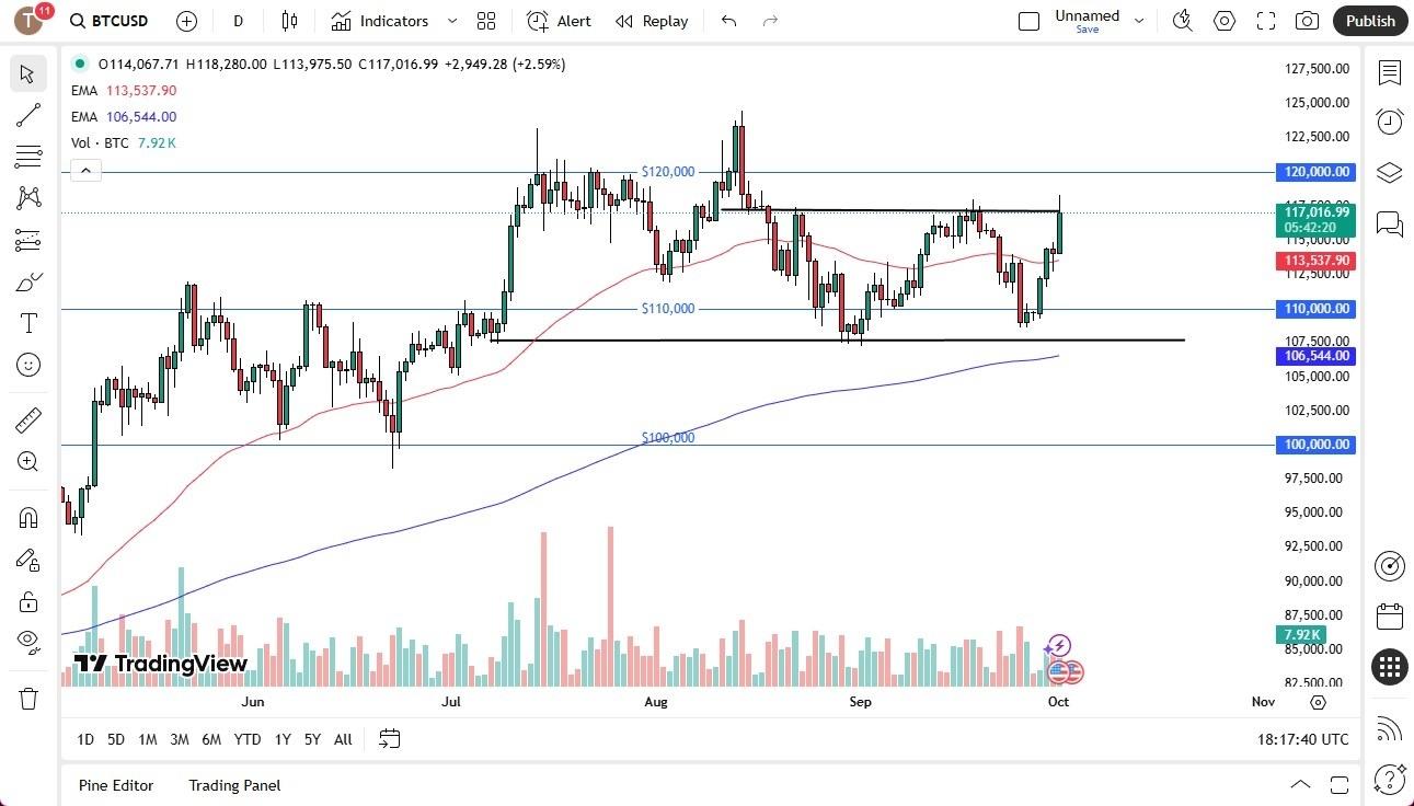 - Bitcoin rallied on Wednesday as we continue to see a lot of noise in the financial markets. The Bitcoin market has been of interest as of late, as we have seen 3 of the 4 last candles show green, and a large range is on top of that. With that being said, we are testing a major resistance barrier that is worth noting near the $117,000 level. The $117,000 level is an area that's been important multiple times, but it looks like we are slamming into that and it's also worth noting that even though the fact that we broke above there at one point during the session, and then turned around to show signs of weakness, suggests to me that we are in fact trying to break out, but seeing plenty of hesitancy.