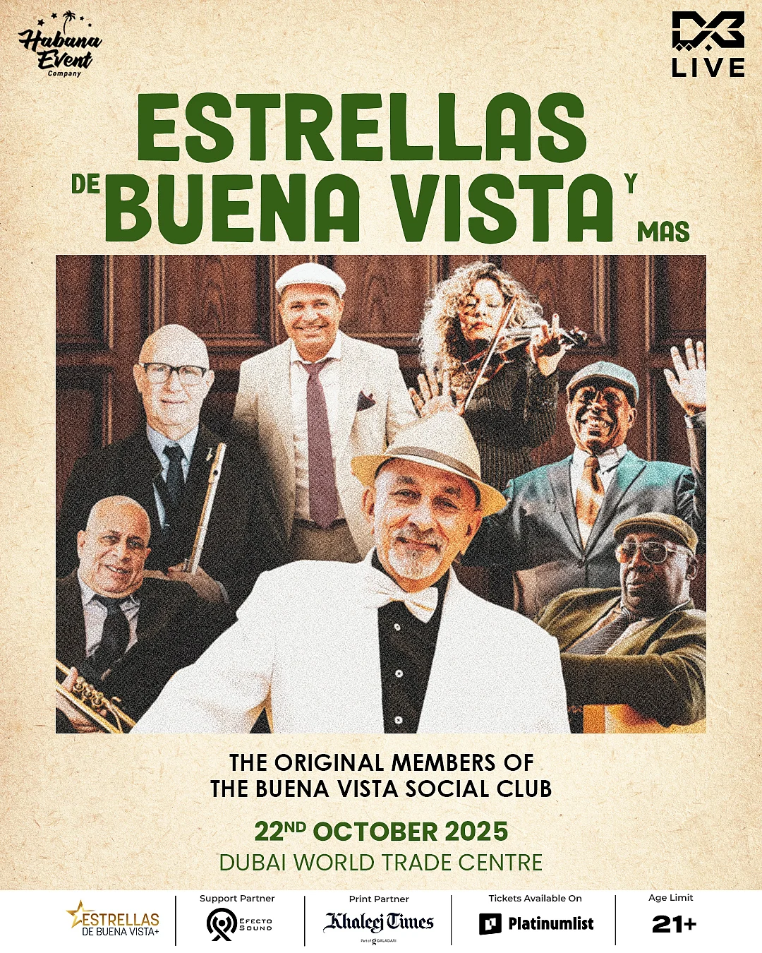 The soul of Havana is set to ignite Dubai as Estrellas de Buena Vista y Más, featuring original members of the legendary Buena Vista Social Club, take the stage at the Dubai World Trade Centre on October 22, 2025.