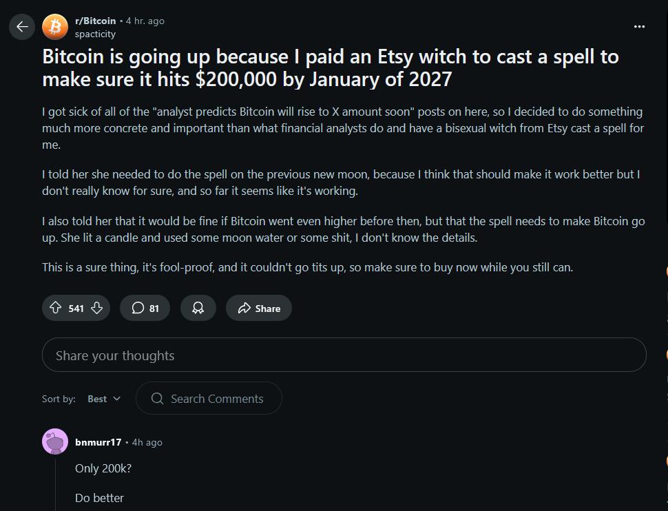 The trend hasn't gone unnoticed within the crypto community, with some users mocking it on social media. A Reddit post revealed a user claiming to have paid an Etsy witch to cast a spell that would ensure Bitcoin's price rises to $200,000 by 2027. The user recounted lighting candles and using“moon water” as part of the ritual, claiming it was a foolproof method to influence markets.