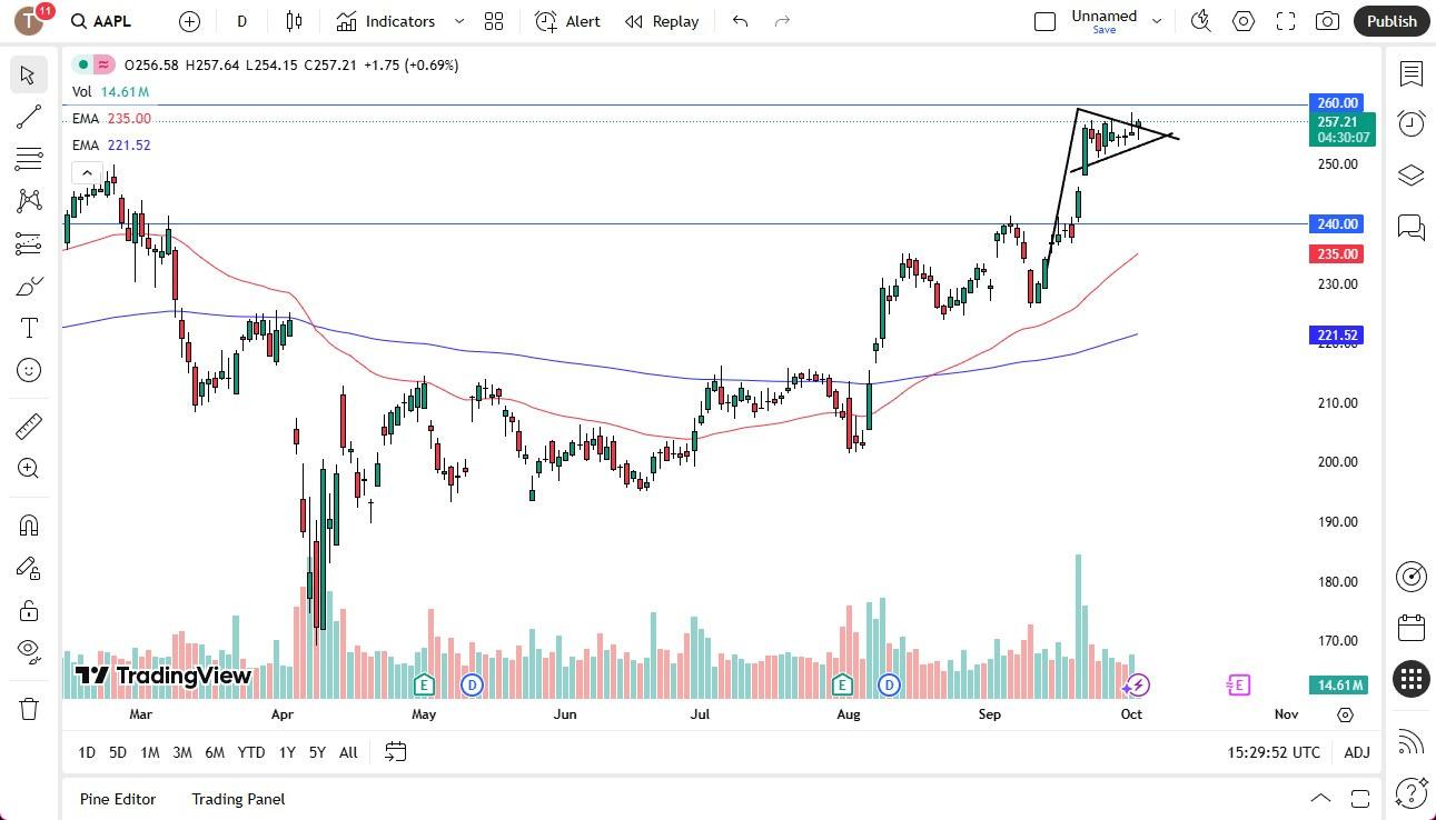 - Apple initially gapped higher to kick off the trading session on Thursday, only to turn around and fall rather rapidly. By doing so, the market ended up filling a gap, testing the middle of the bullish pendant that we had been in, and then turned around to show signs of continuation. At this point, Apple continues to be a very bullish market just waiting to break out, and I do think that it is probably only a matter of time before that does in fact happen.