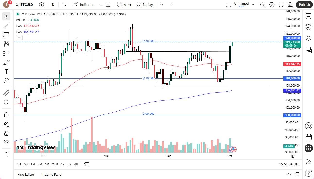 - The bitcoin market saw more buying during the trading session on Thursday, continuing to add to the massive gains that were accomplished on Wednesday. The range of candlestick for the Thursday session is smaller than the Wednesday session, but ultimately, the most important thing that we are paying attention to here is $1000 level as it is a large, round, psychologically important figure. Short-term pullbacks will continue to be thought of as buying opportunities, but if we just simply sliced through the $120,000 level, then we will almost certainly challenge the recent all-time highs. That would have Bitcoin reaching the $124,000 level.