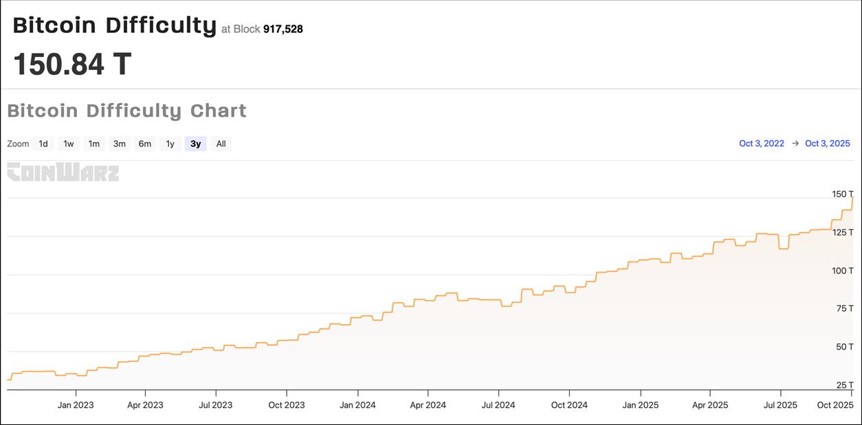 - CleanSpark's Bitcoin holdings increased, with 13,011 BTC held at September's end. The company mined 629 BTC in September, a 27% rise year-over-year, and sold 445 BTC for approximately $48.7 million. Operational efficiency improved by 26% compared to the previous year, with an average hashrate of 45.6 EH/s. Despite positive financials, the industry faces challenges including rising energy costs and tariff risks on imported mining rigs. Bitcoin's mining difficulty has hit record highs, demanding more computational power and energy usage from miners.