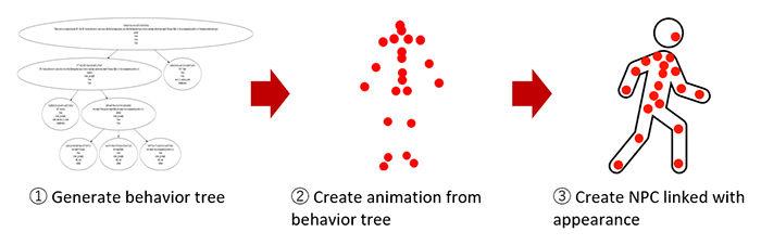 In addition, automatic linkage of the three generative AIs makes it possible to link the behavior tree generated by the behavior-logic-generative AI, the NPC skeletal data generated by the animation-generative AI, and the 3D model of the NPC generated by the appearance-generative AI, thereby allowing the automatic generation of NPCs using only text.