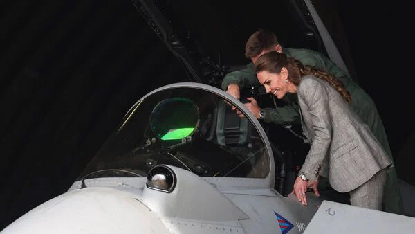 Kate, who was visiting the airbase in her capacity as Royal Honorary Air Commodore, wore a tailored grey suit paired with pointed heels as she toured one of the aircraft. As she made her way down the narrow, steep metal stairs backwards, she didn't miss a single step, prompting applause and admiration from fans online.