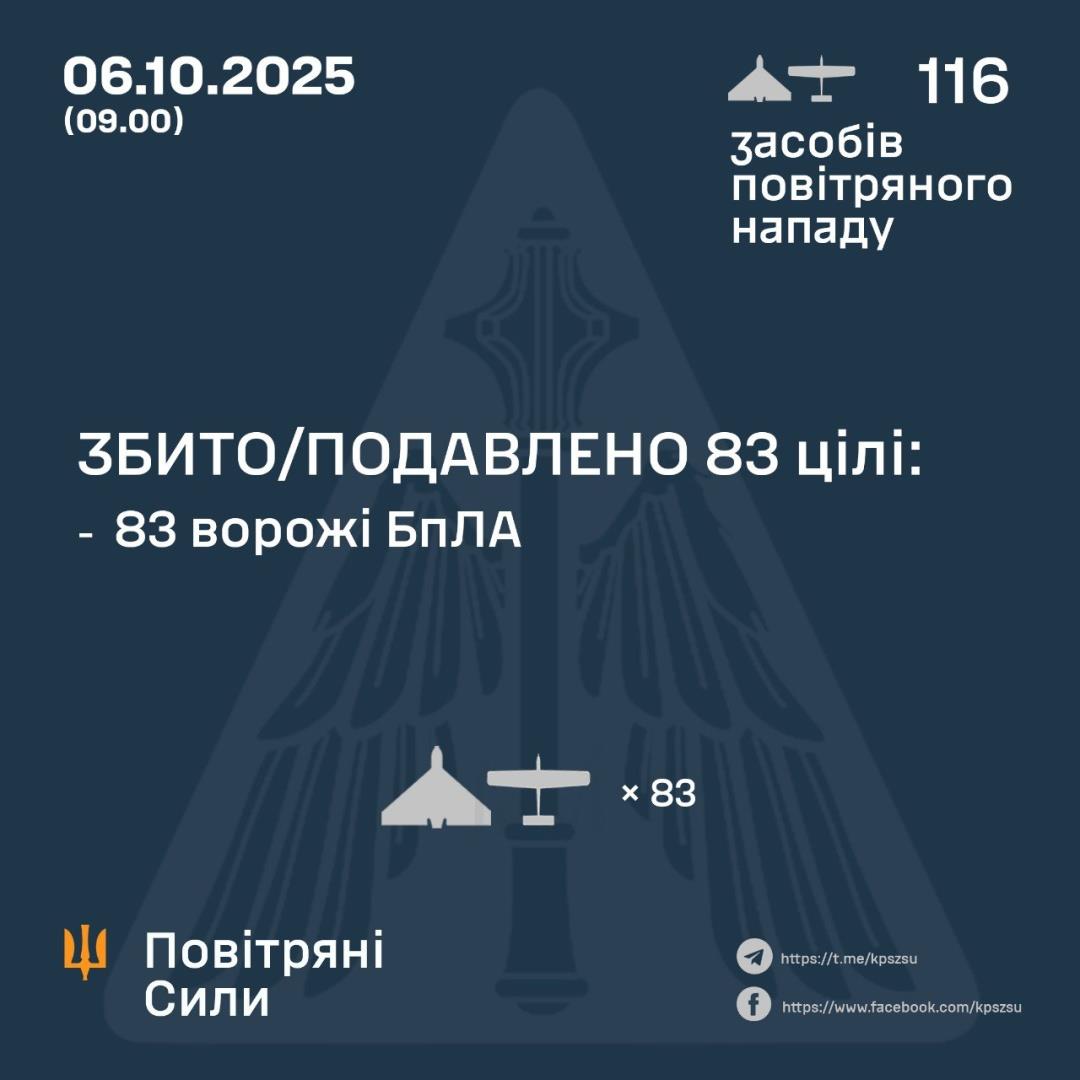 According to preliminary data, as of 9:00 on Monday, October 6, air defense forces had shot down or neutralized 83 drones over northern, southern, eastern, and central Ukraine.