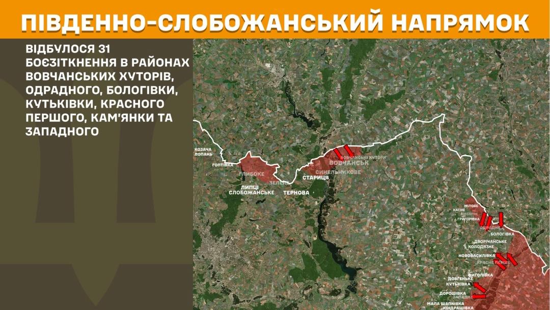 Over the past day, in the Southern Slobozhanshchyna sector, there were 31 combat engagements near Vovchanski Khutory, Odradne, Boholivka, Kutkivka, Krasne Pershe, Kamianka, and Zapadne.