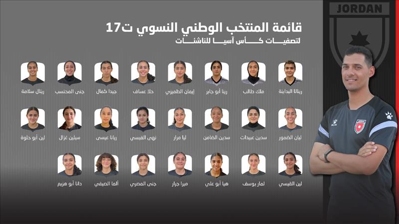 Amman, Oct. 6 (Petra) -- The technical staff of the Jordan U-17 Women's National Football Team has announced the final 23-player squad set to compete in the AFC U-17 Women's Asian Cup Qualifiers, scheduled to take place from October 13 to 17 in Aqaba.