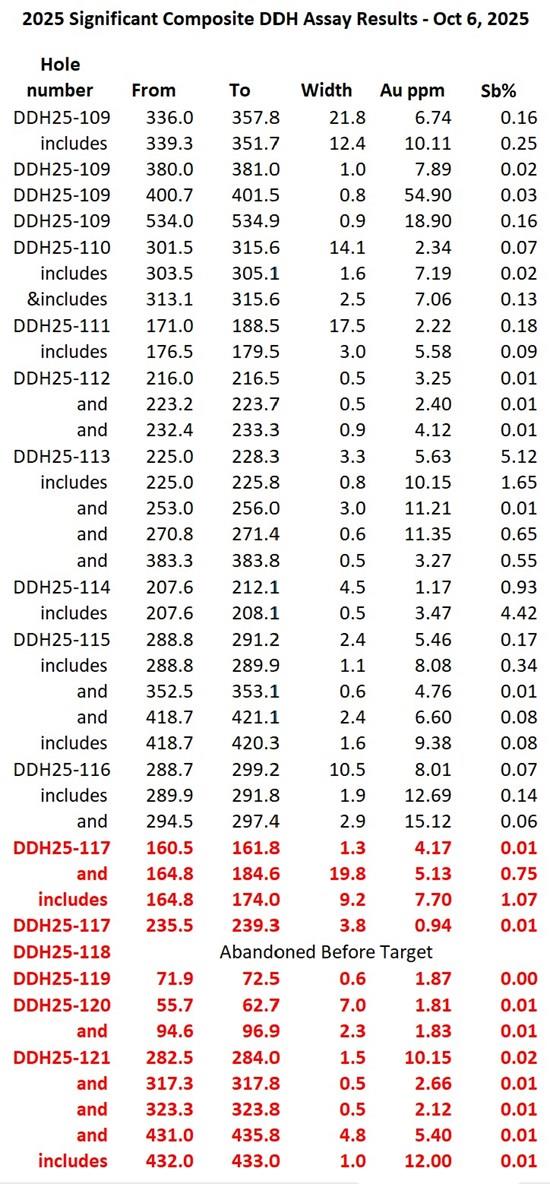 - Drill hole DDH25-117 returned 5.13 grams per tonne ("gpt") gold & 0.75% antimony ("Sb") over 19.8 metres ("m") , including 7.70 gpt gold & 1.07% Sb over 9.2 m . This hole successfully intersected the mineralized Royal Shear structure at a downhole depth of 164.8 m within the Imperial Zone, and was drilled with large diameter HQ core to collect mineralized material for the ongoing metallurgical test work program. The previously undrilled Crown "Gap" Zone continues to grow with additional mineralized intersections returned from widely spaced drill holes. All three drill holes intersected mineralization at the Royal Shear contact.
