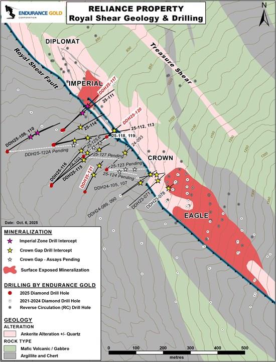- Drill hole DDH25-119 intersected the Royal Shear contact at a downhole depth of 71.9 m. The hole returned 1.89 gpt gold over 0.6 m associated with an unmineralized feldspar dyke within the structural target host area. In this area, most of the mineralized zone target is interpreted to have been replaced by the feldspar dyke intrusive. Drill hole DDH25-120 was a shallower angled hole drilled from the same pad and intersected the Royal Shear 50 m up-dip from DDH25-119 with 1.81 gpt gold over 7.0 m starting at a downhole depth of 55.7 m. This is the first intersection of near-surface mineralization returned from the Crown Zone.