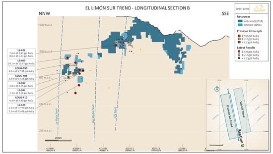 Figure 2: Drilling results along the El Limón Sur Trend indicate the potential to expand resources at depth