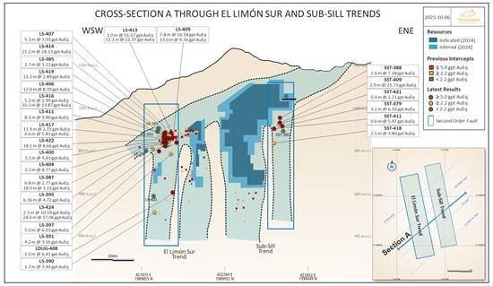 Recent drilling along the El Limón Sur Trend has been focused on the central and northern zones, near the Trend's intersections with the Z71 and La Flaca faults (Figure 2). Drilling has confirmed continuous high-grade intercepts at levels above 750 m.a.s.l. (LS-403, LS-421, LDUG-390, and LDUG-410) where mineralization remains open laterally. More discrete intercepts with very high grades were encountered at depth (LS-425) down to at least 480 m.a.s.l., demonstrating mineralization remains open in that direction. These results show potential for new Inferred Resources.